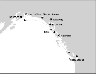 | Denali Park, Seward, Hubbard Glacier, Juneau, Skagway, Sitka, Ketchikan, Vancouver |